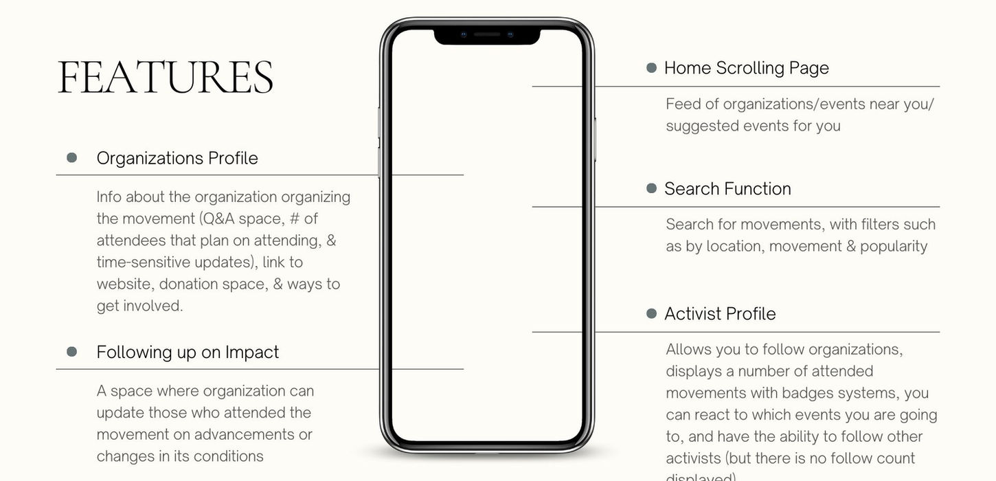 The profile section of the app would enable users to create a personalized experience with a variety of different app uses. Movement seekers could follow organizations they care about and receive updates about their events, ways to get involved and other campaigns. The app would also feature a mark of attending/badges system, allowing users to show their support and engagement with social movements. Users would be able to react to the events they are attending, and they could follow other activists whose actions or interests they find inspiring. The profile of a movement seeker would not be based on follower counts and instead focused on the content and actions that the user is taking part in.